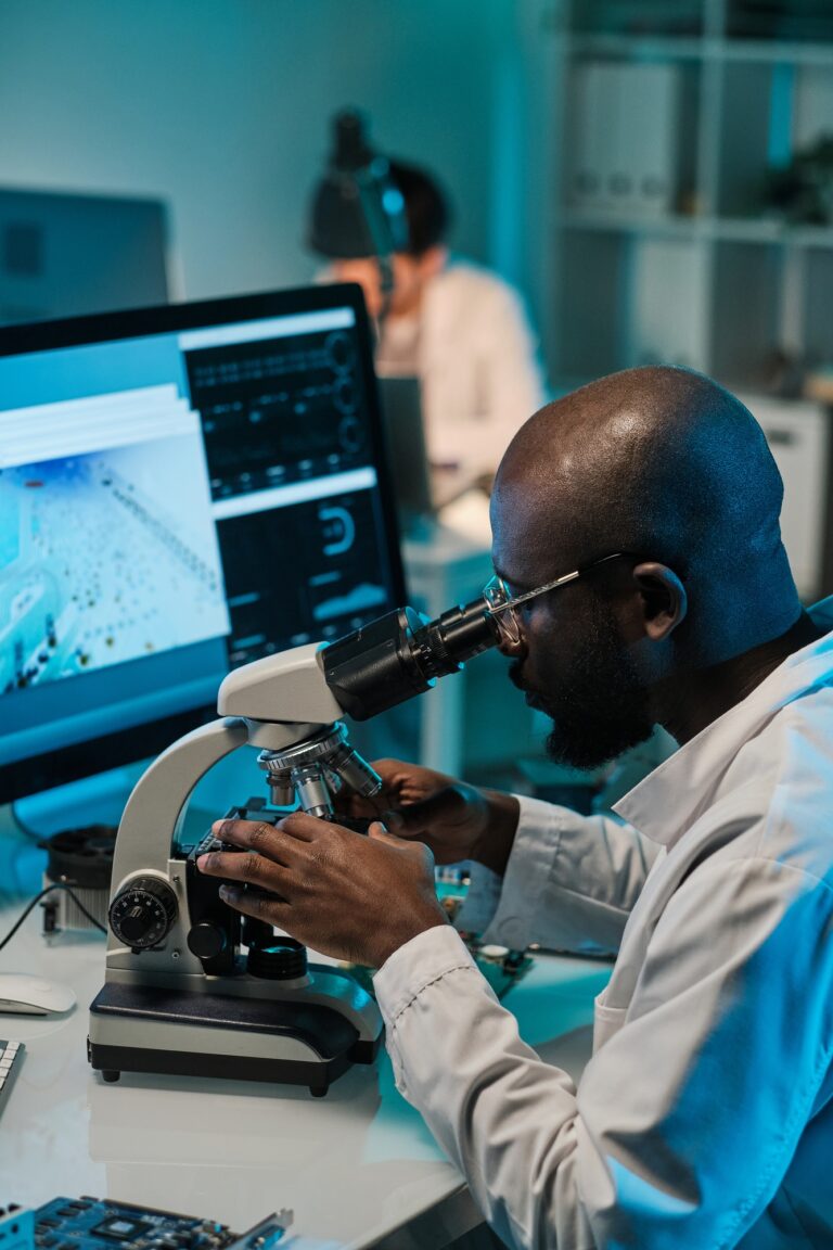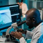 young-man-of-african-ethnicity-sitting-by-workplace-and-looking-in-microscope...